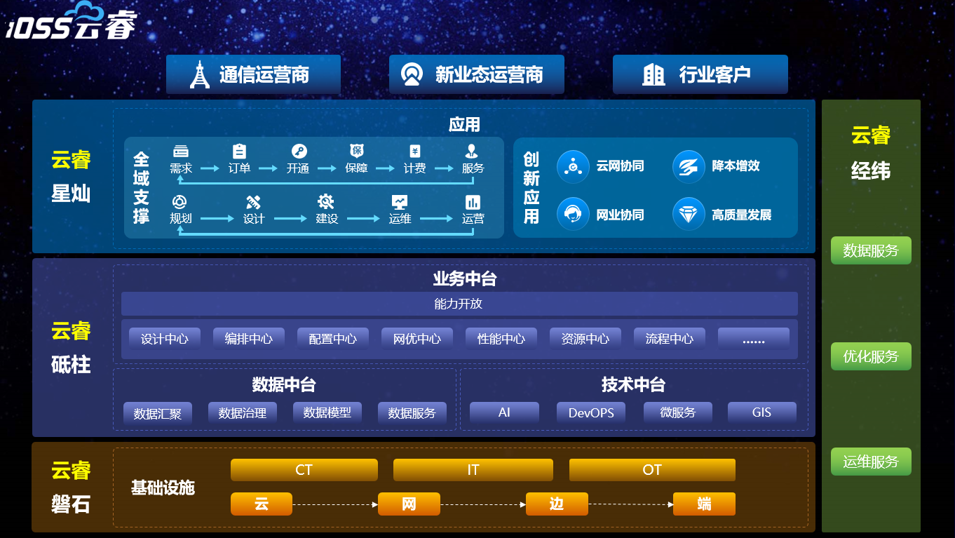 9001cc 以诚为本 9001cciOSS云睿4大方向:云睿磐石、云睿砥柱、云睿星灿、云睿经纬,包括但不限于数据中心基础设施管理(DCIM)系统解决方案,智慧中台解决方案,基础FCAPS能力(资产管理、故障管理、性能管理、优化管理)及质效运维、电子运维、代维管理、能耗管理、指挥调度、智能运维、成本管理、费用稽核等系统解决方案,家集客解决方案,新业务支撑(5G业务设计、编排、保障管理)解决方案,云网融合服务解决方案,能力开放解决方案,运维服务解决方案等等。