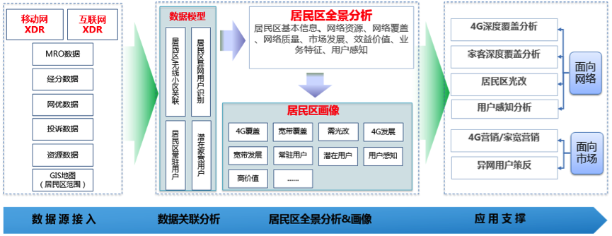 基于移动网/互联网DPI数据、MR数据、经分数据、资管数据、网优及投诉等数据,从居民区及用户维度召开分析,为4G深度覆盖规划、家宽/4G套餐精确营销、异网用户策反、带宽提升或光改给予支撑建议。